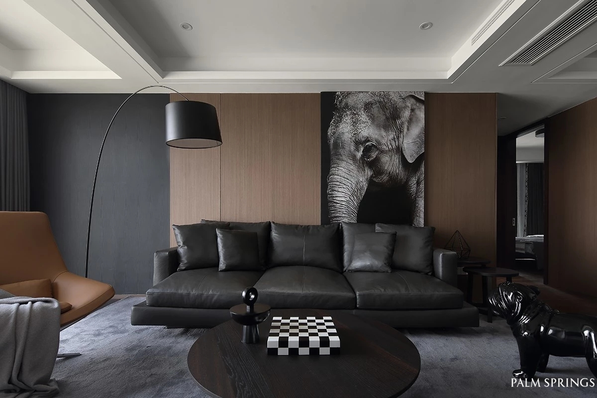 客厅为以开放式手法揉合丰沛采光,让室内装饰有着温煦光感,显得深邃低调仍含光影层次。木质感的棕色沙发背墙延展温润气息,借此缓和金属,皮革、石材所带来的凛冽感。