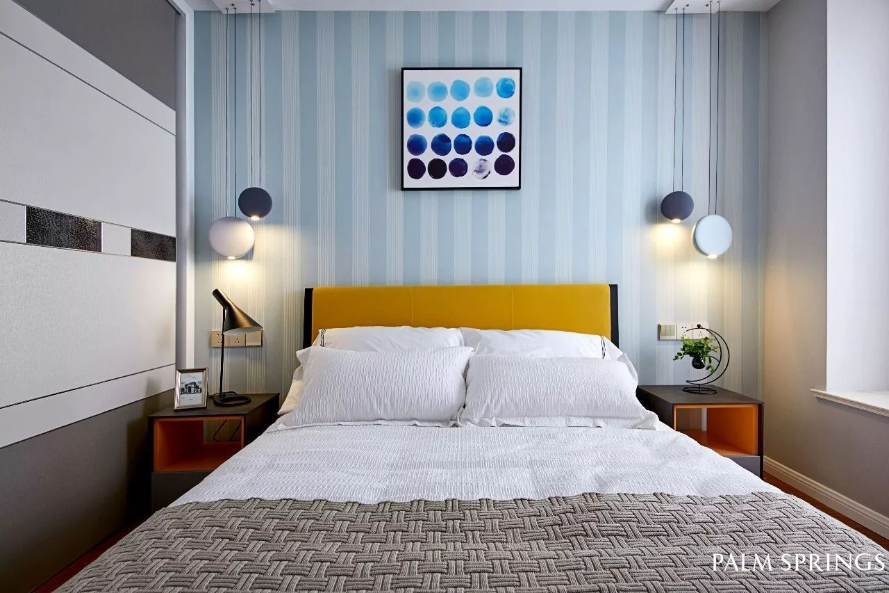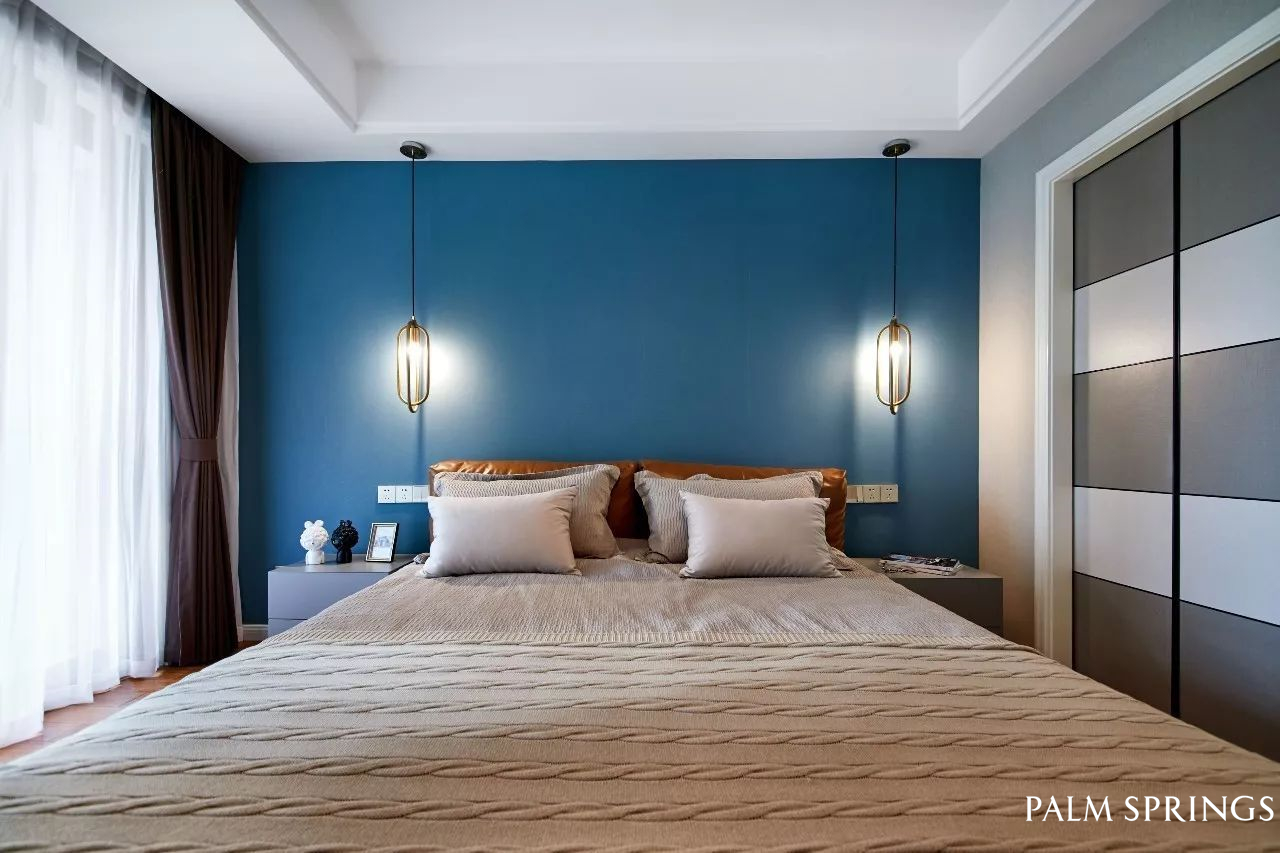 主卧蓝色墙纸和床背橙色形成视觉缓冲,色彩对比。金属质感的吊灯个性十足,垂挂流动性,形成立体空间的呼应,凯特床的加入让卧室温馨自然,像迷失在浪漫海岸线的恋人,沉醉于此。