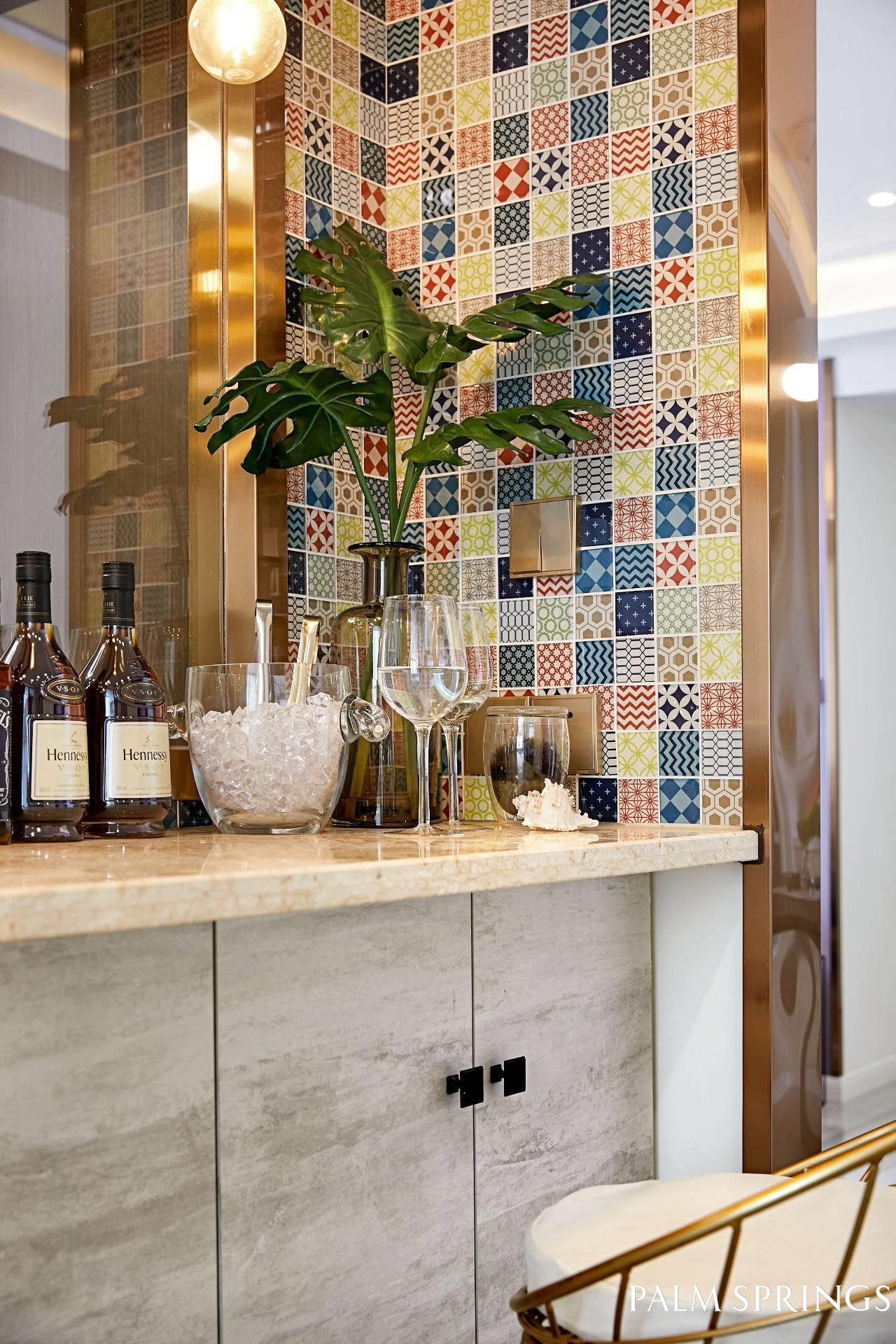 餐厅一侧的吧台,彩色马赛克砖让人眼见一亮,金属结合木质,现代气息浓厚又不失情调。