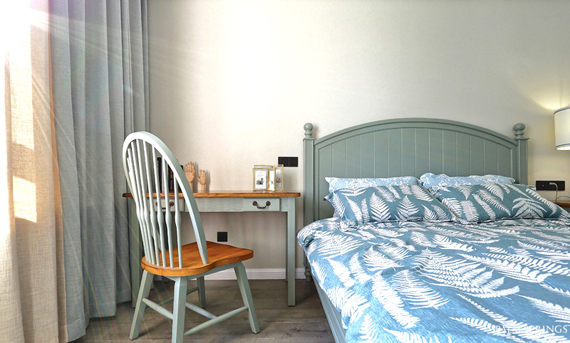 不同于主卧原木系的装饰,男孩的房间选用了亮色系实木床和书桌。阳光透过窗户洒落进来,营造出清新明亮的温馨氛围,给孩子的一个畅游的小天地。