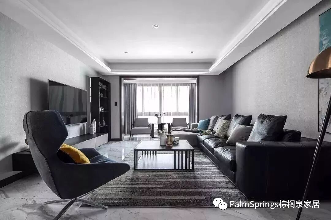 ▼ 客厅空间以黑色和灰色为主基调,石材纹理的地板与灰、白墙面形成层次对比,而大面积的玻璃窗让光线进入到室内而变得明亮柔和。客厅黑色皮质雷诺沙发和妮可茶几,结合布艺的色彩丰富层次,并融合亮铜色的金属细节,让原本低调的空间多了些许华丽质感。